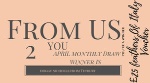 Congratulations Hoggy April 2018 Winner of our £25 Voucher Hoggy Nicholls Just e us and we will send your code. Happy shopping and well done for just being subscribed you can choose something gorgeous from our new summer collection just arrived.mail us at info@feathersofitaly.co.uk to claim.