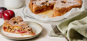 Plum Crumble CakeThis autumnal pudding is pure comfort food. Sticky, sweet and with a crunchy topping, serve it with good-quality vanilla custard or ice-cream. SERVES 12 TOTAL TIME 15 Minutes Ingredients 175g of unsalted butter, softened, plus 75g for topping 200g of caster sugar 2 eggs 200g of plain flour, plus 100g -