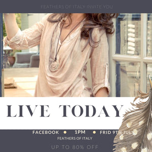 Feathers of Italy Italian Clothing Brand Live at 12.30 today on Facebook 8th July showing you some of our bargain summer wear in our up to 80% off sale.