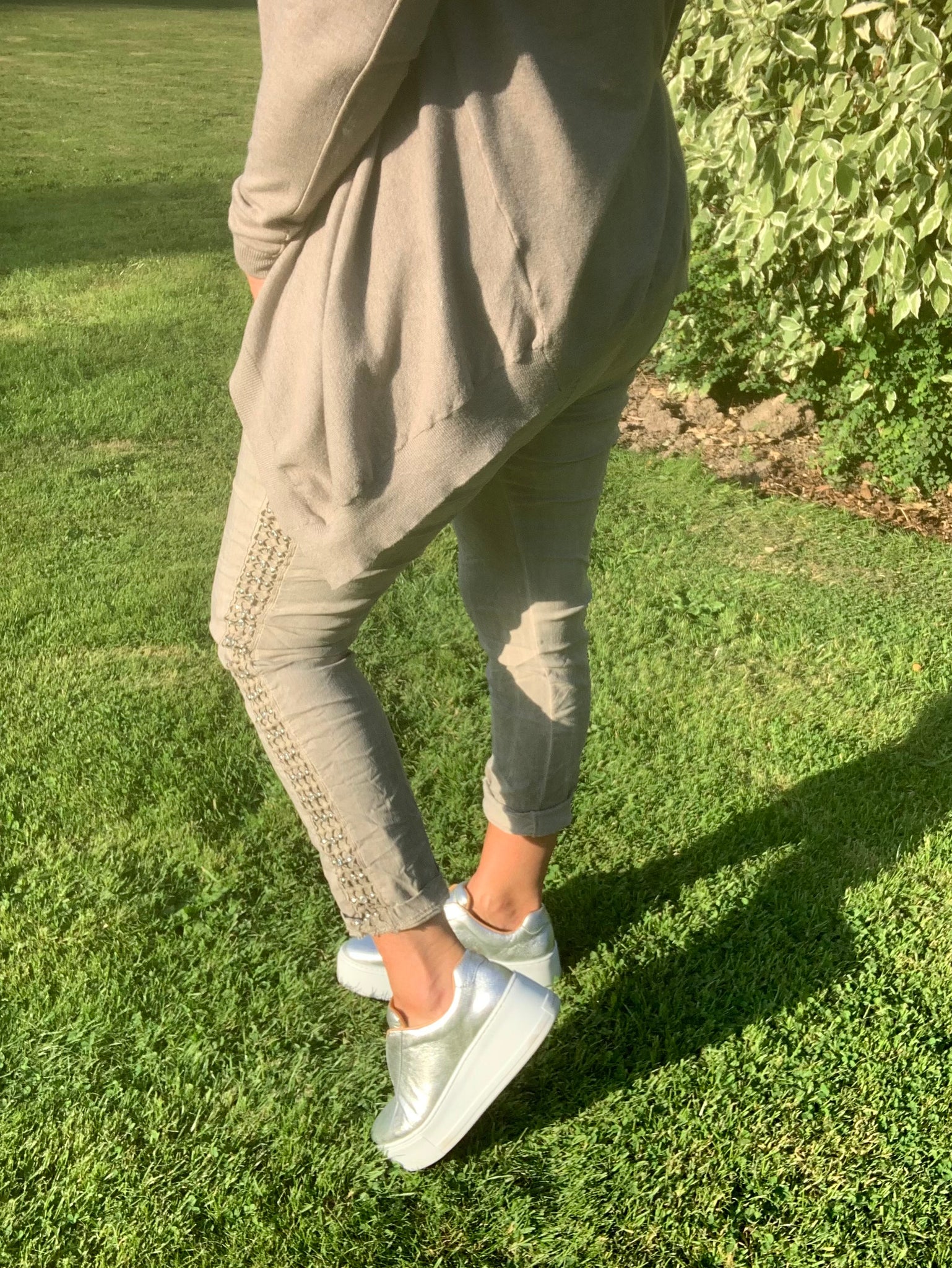 Amazing Woman crinkle Jeans with draw string waist and back pocket detail each of these amazing super stretch jeans has cute detail from encrusted diamanté and studs in the webbing down the side. These have to be your only ever purchase if you can never find a pair of jeans to fit these are your go to super stretchy glamorous jeans.