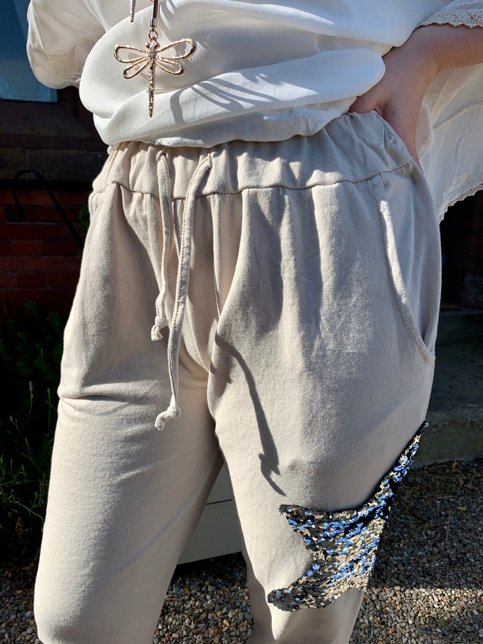 An elasticated waist casual Jogger with a huge sequined star sewn on the side for huge amounts of glam! sparkle where ever you go in these great relaxed trousers, one size and in various colours.
